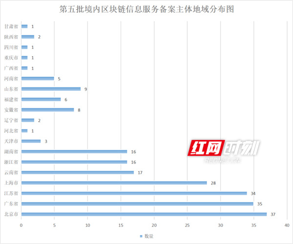 全國(guó)第五批境內(nèi)區(qū)塊鏈信息服務(wù)備案主體地域分布圖。